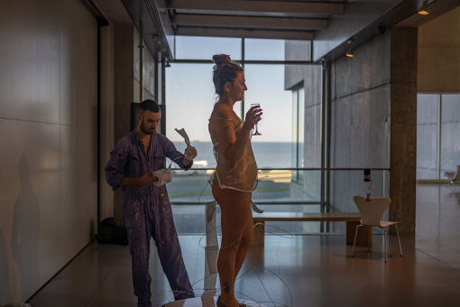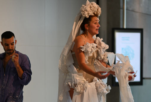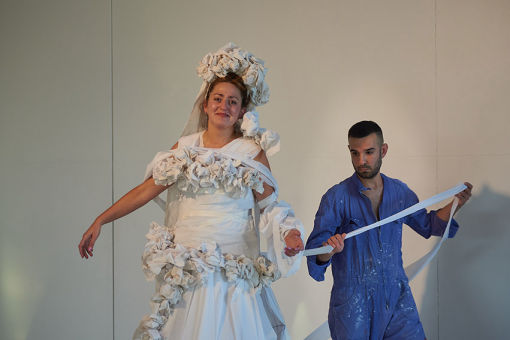 Durante la performance, quien actúa interpreta el relato mientras el autor construye sobre su cuerpo, en tiempo real, un vestido de novia realizado con papel higiénico, en clave escultórica. Hacia el final, el vestido lo asfixiará hasta el punto en que solo podrá destruirlo, marcando así la conclusión del hecho artístico.